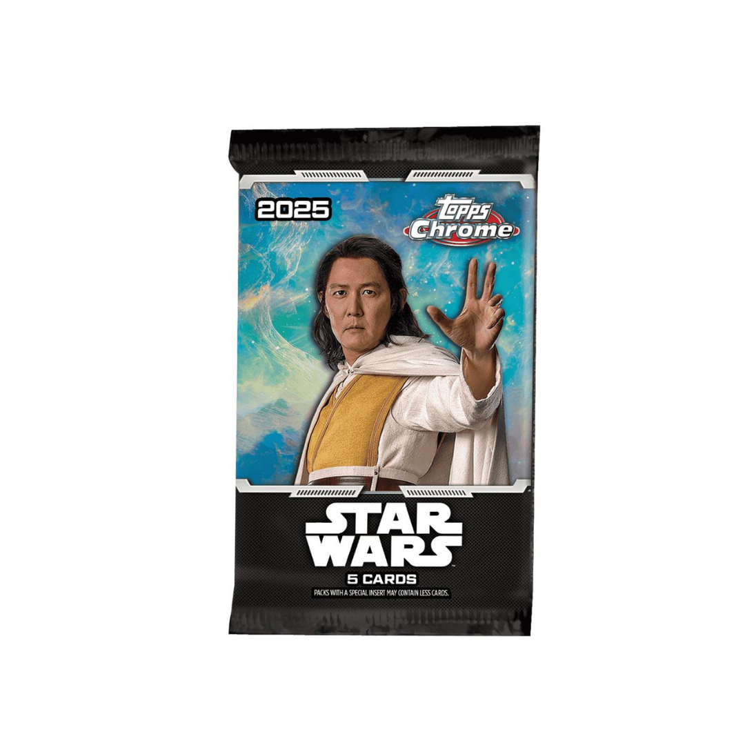 2025 Star Wars Chrome er tilbake med alle dine favorittkarakterer fra hele galaksen i ny Chrome-teknologi. Star Wars Chrome inkluderer nye parallels, spennende inserts og nye signaturer! Let også etter DEBUT-kort som markerer første gang en karakter dukker opp på et Topps samlekort!